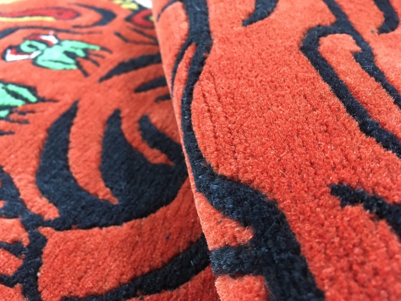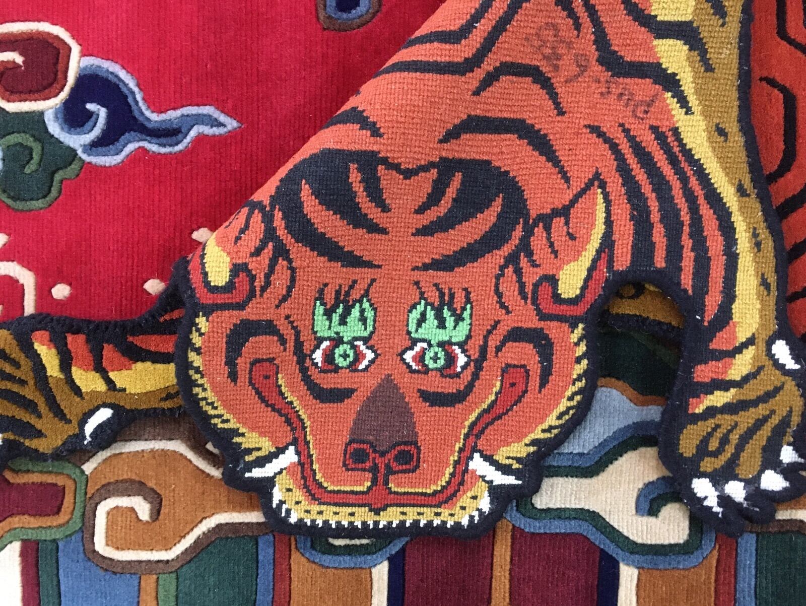 タイガーラグはもともと、チベットの密教僧が使っていたものです。虎には魔除けの効果があると信じられていたことから、瞑想の際の邪気祓いの目的で使用されていました。