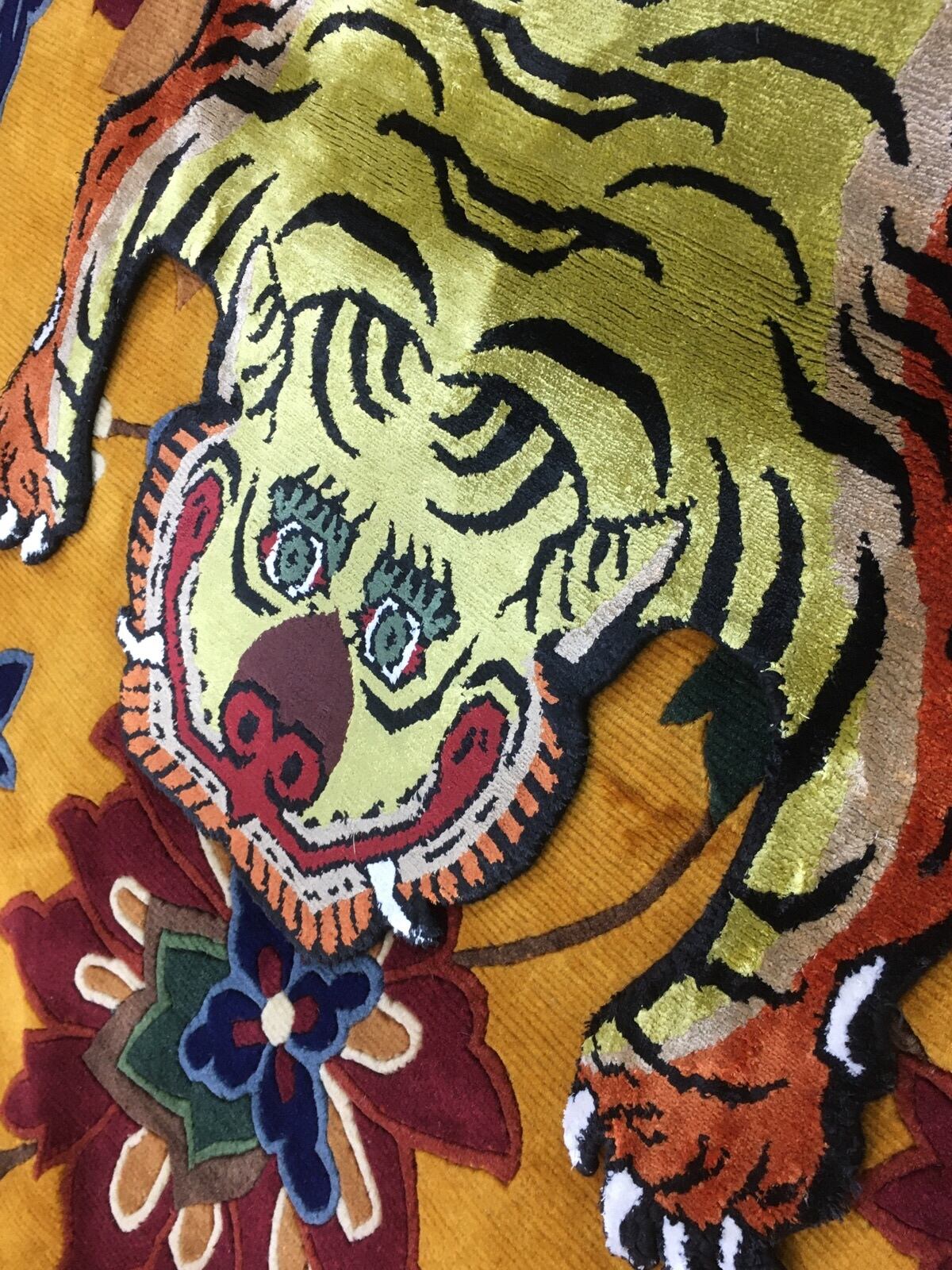 タイガーラグはもともと、チベットの密教僧が使っていたもので、魔除けの効果があるとされていたことから、瞑想の際の邪気祓いの目的で使用されていました。